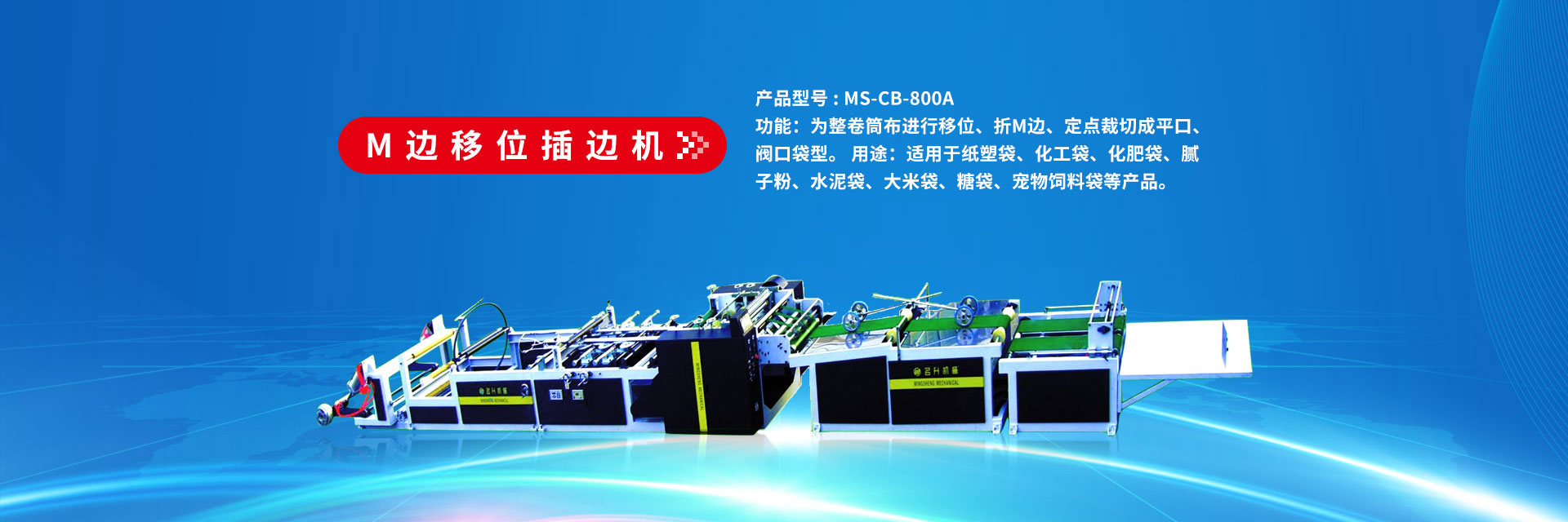 功能:為整卷筒布進(jìn)行移位、折M邊、定點(diǎn)裁切成平口、閥口袋型。